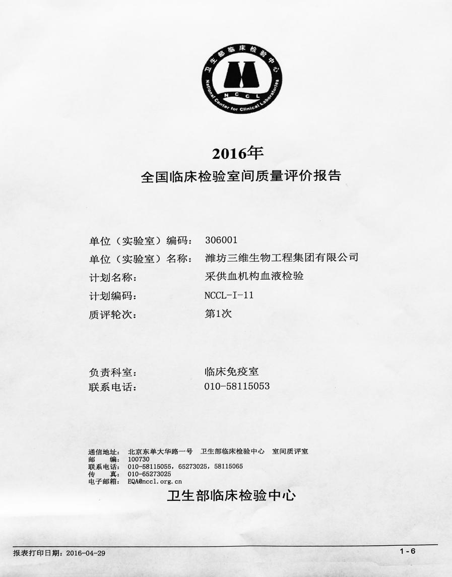 3V血筛试剂盒在卫生部临检中心2016年第1次室间质评中取得满分成绩