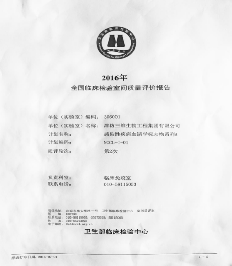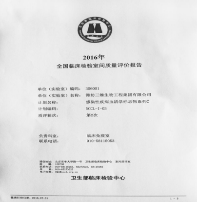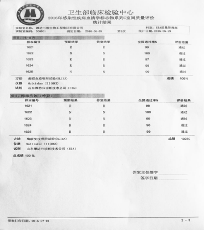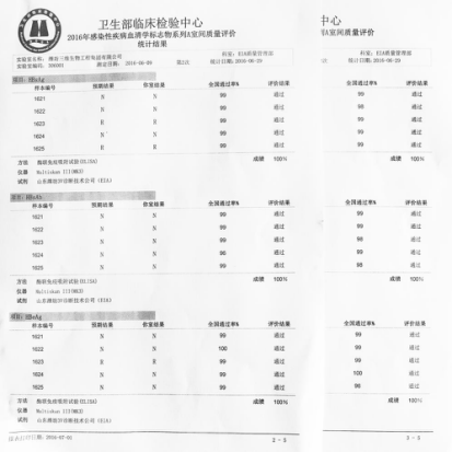 我公司每年都参加卫生部临检中心的室间质评。2016年7月1日又传捷报, 酶免产品HBsAg、HBsAb、HBeAg、HBeAb、HBcAb、抗-HCV以满分成绩通过卫生部临检中心感染性疾病血清标志物A第2次室间质评;抗-HIV、梅毒抗体(特异)以满分成绩通过感染性疾病血清标志物C第2次室间质评。