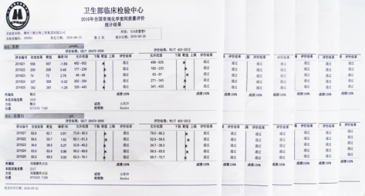 我公司每年都参加卫生部临检中心的室间质评。2016年7月1日又传捷报, 我公司常规化学产品钙、磷、镁、铁、血糖、尿素、尿酸、肌酐、总蛋白、白蛋白、总胆固醇、甘油三酯、丙氨酸氨基转移酶、天门冬氨酸氨基转移酶、淀粉酶、肌酸激酶、乳酸脱氢酶、γ-谷氨酰基转移酶、α-羟丁酸脱氢酶、胆碱酯酶、直接胆红素全部以满分成绩通过卫生部临检中心第2次室间质评。