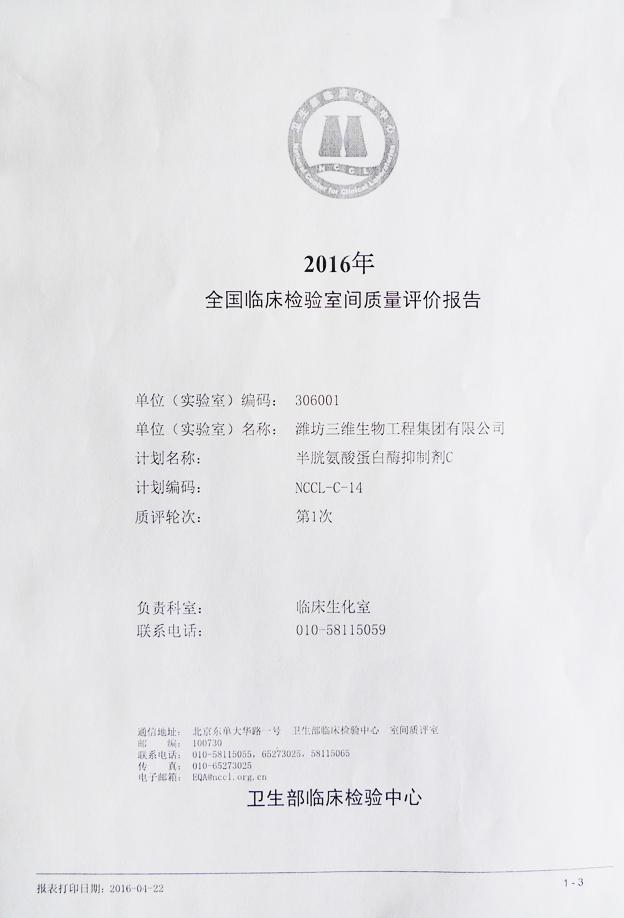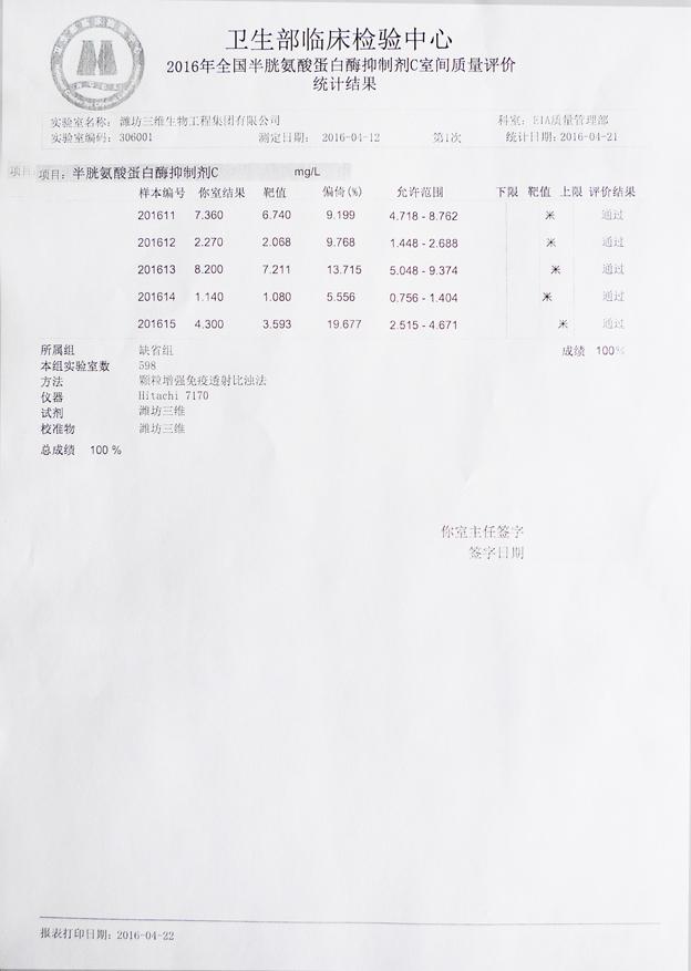 我公司每年都参加卫生部临检中心的室间质评。2016年4月22日又传捷报,胱抑素C试剂盒以满分成绩通过卫生部临检中心第1次室间质评。