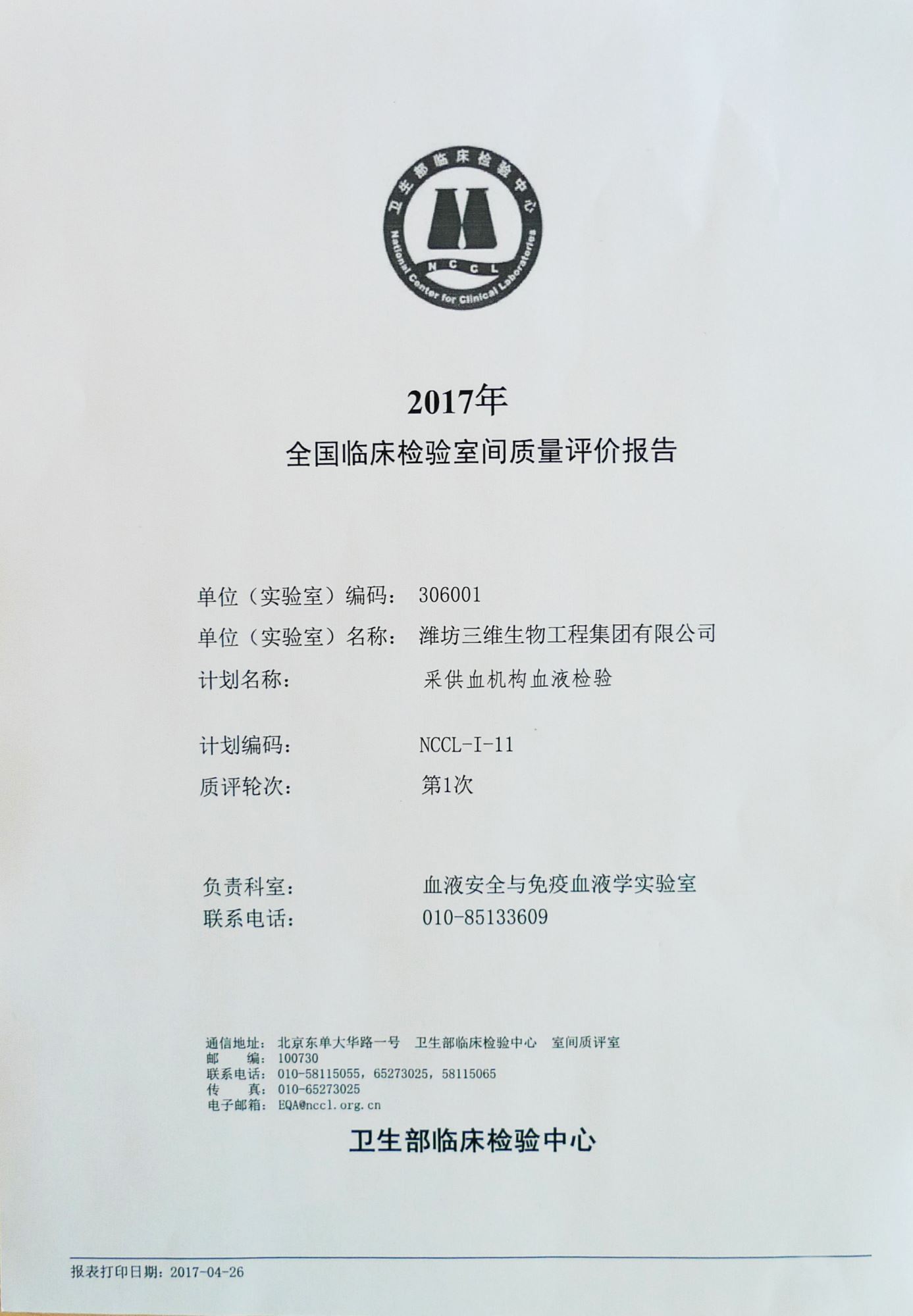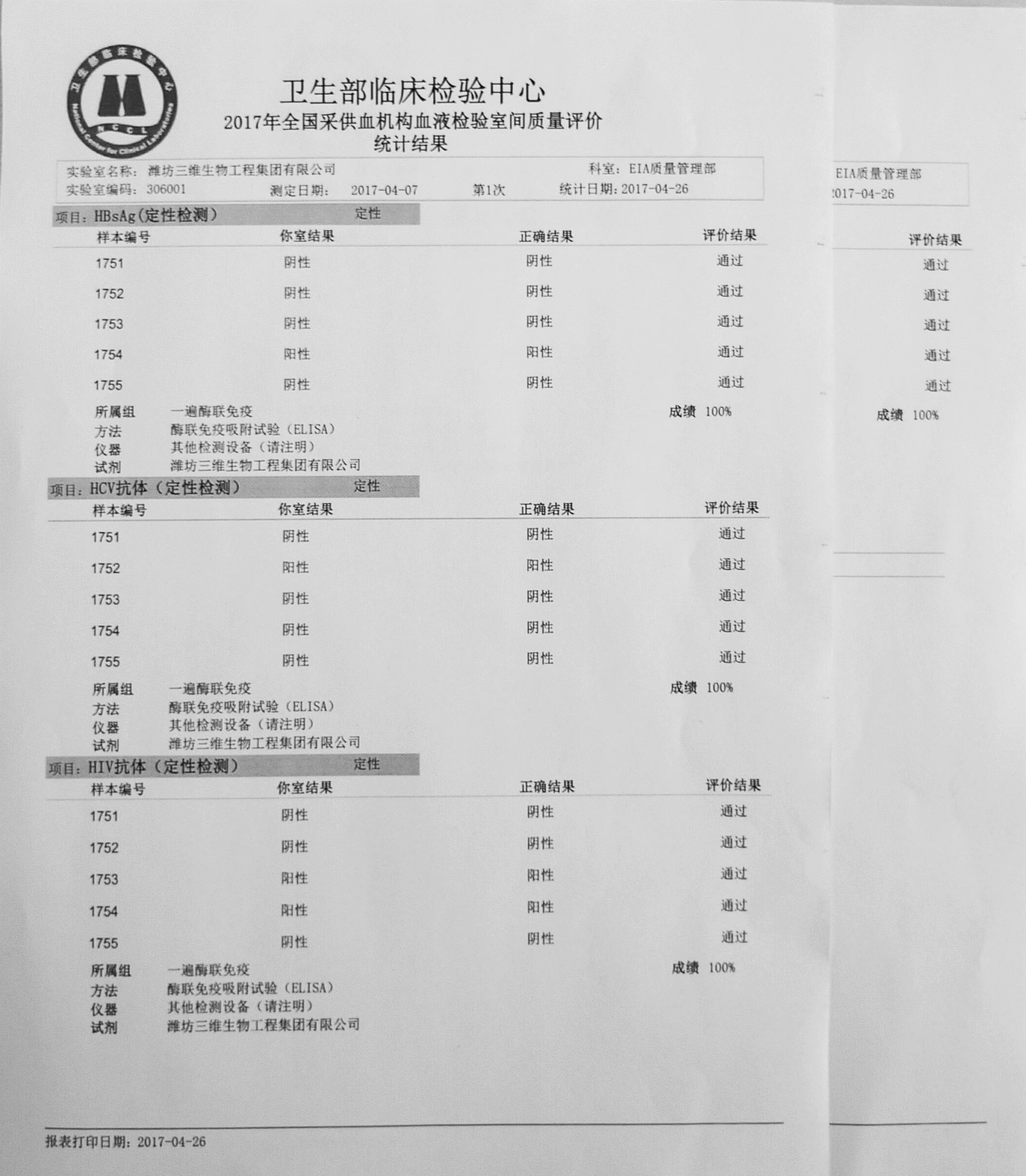 2017年4月26日,我公司采供血机构血液检验产品HBsAg、抗-HCV、抗-HIV(1+2)、抗-TP全部以满分成绩通过卫生部临检中心第1次室间质评。