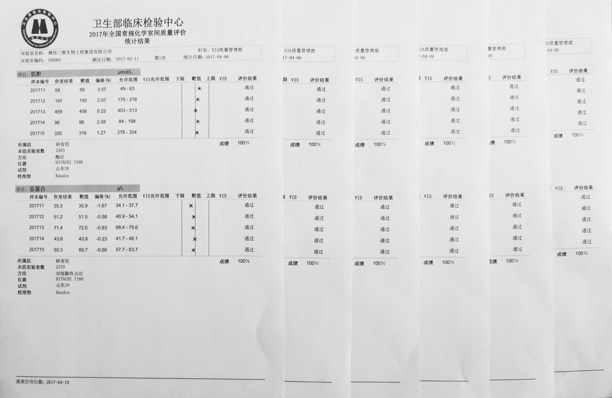 我公司每年都参加卫生部临检中心的室间质评。2017年4月10日又传捷报, 我公司常规化学产品钙、磷、镁、铁、血糖、尿素、尿酸、肌酐、总蛋白、白蛋白、总胆固醇、甘油三酯、丙氨酸氨基转移酶、天门冬氨酸氨基转移酶、淀粉酶、肌酸激酶、乳酸脱氢酶、γ-谷氨酰基转移酶、直接胆红素、α-羟丁酸脱氢酶、胆碱酯酶以满分成绩通过卫生部临检中心第1次室间质评。